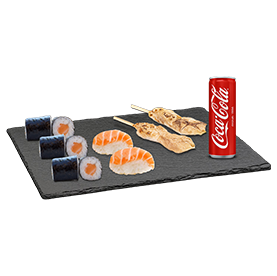 1 Maki roll à composer + 1 Paire sushi saumon + 1 Paire brochettes de poulet + 1 Accompagnement au choix + 1 Boisson 33cl au choix.