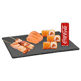 1 Salmon roll à composer + 1 Paire sushi saumon + 3 Sashimi saumon + 1 Accompagnement au choix + 1 Boisson 33cl au choix.