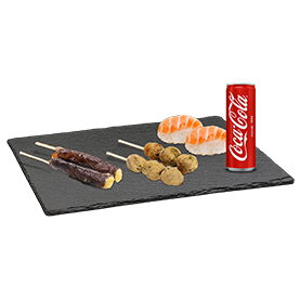 1 Paire brochettes boeuf fromage + 1 Paire brochettes boulettes poulet + 1 Paire sushi saumon + 1 Accompagnement au choix + 1 Boisson 33cl au choix.