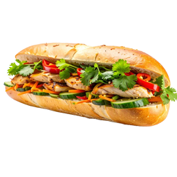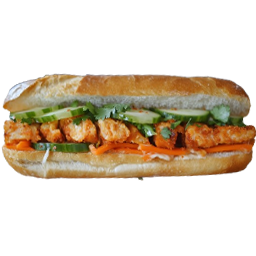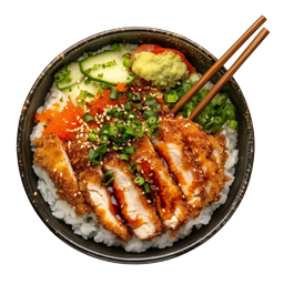 Poulet pané, concombre, oignons, carottes, coriandre, pousse de soja et sauce Tori.